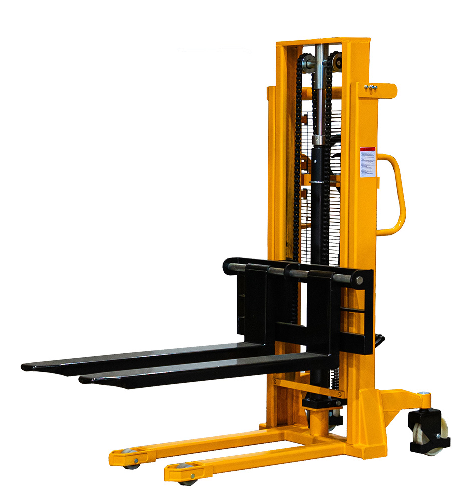 Подъем осуществляется при помощи ручного рычага или складной ножной педали, опускание груза с помощью нажатия планки переключения режимов на рукоятке управления. Горизонтальное перемещение штабелера производится в ручном режиме. В зависимости от высоты подъема может оснащаться мачтами с одной или двумя секциями.