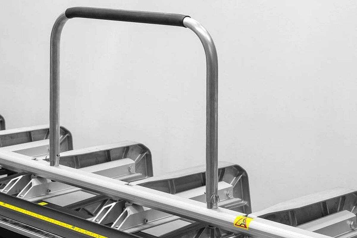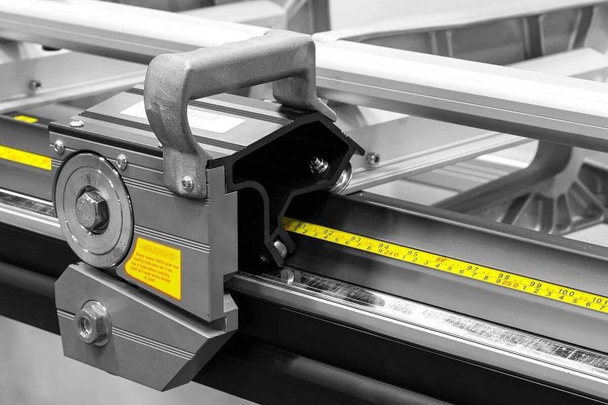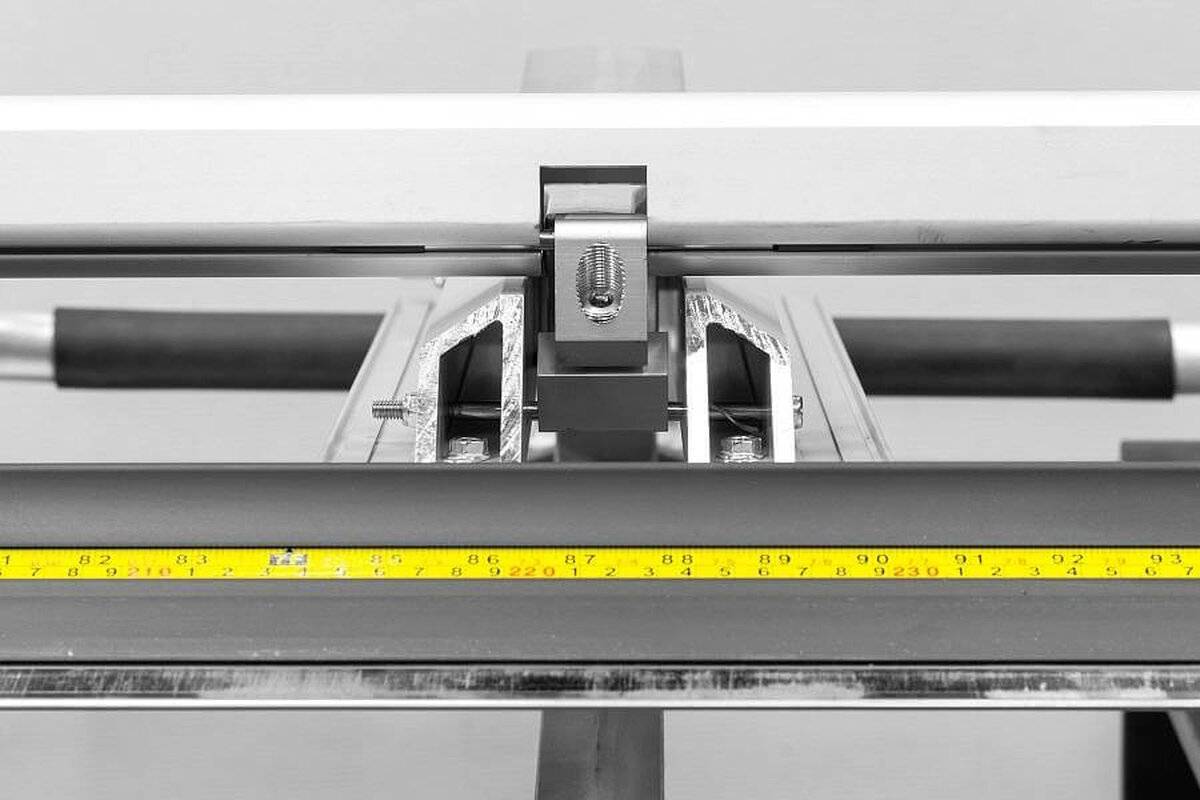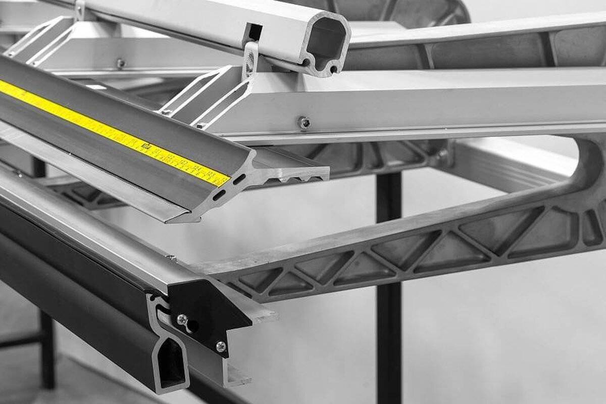 Изготовлена из усиленного алюминиевого профиля. В конструкции предусмотрен «рельс» для роликового ножа и установки угломеров. Кромка планки имеет радиус всего 2мм и дополнительно защищена от повреждения стальным уголком.