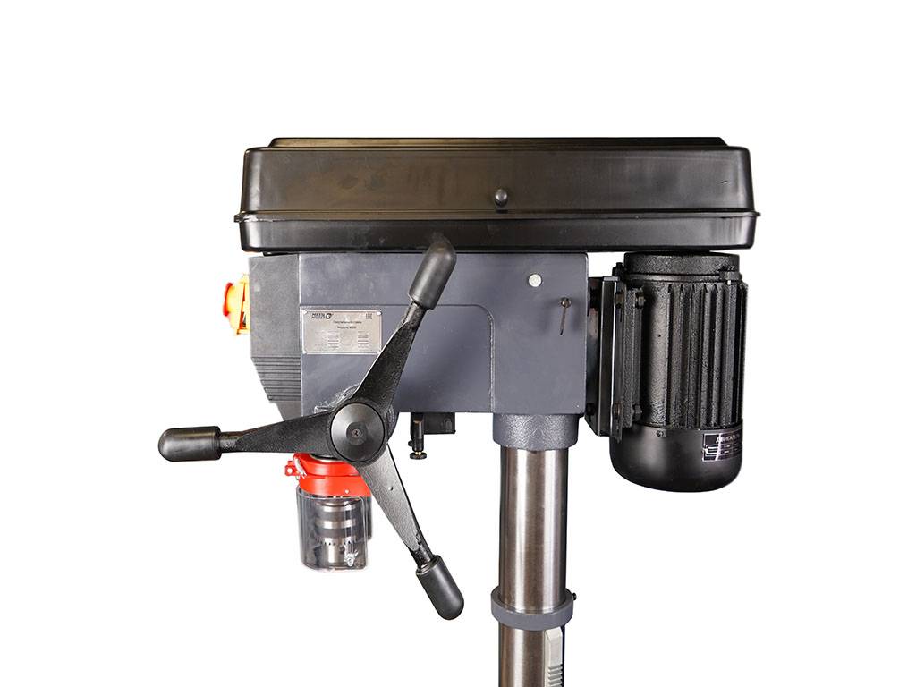 На лицевой стороне сверлильной головы расположены кнопки включения и выключения станка с крышкой, которая также используется как аварийный выключатель.