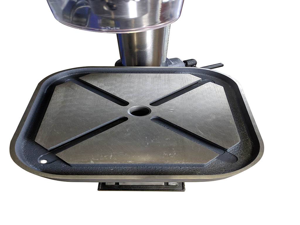 Сверлильный стол имеет возможность поворота на 45° в обе стороны по вертикали для обработки отверстий под углом. Стол оснащен пазами для крепления заготовок и оснастки.