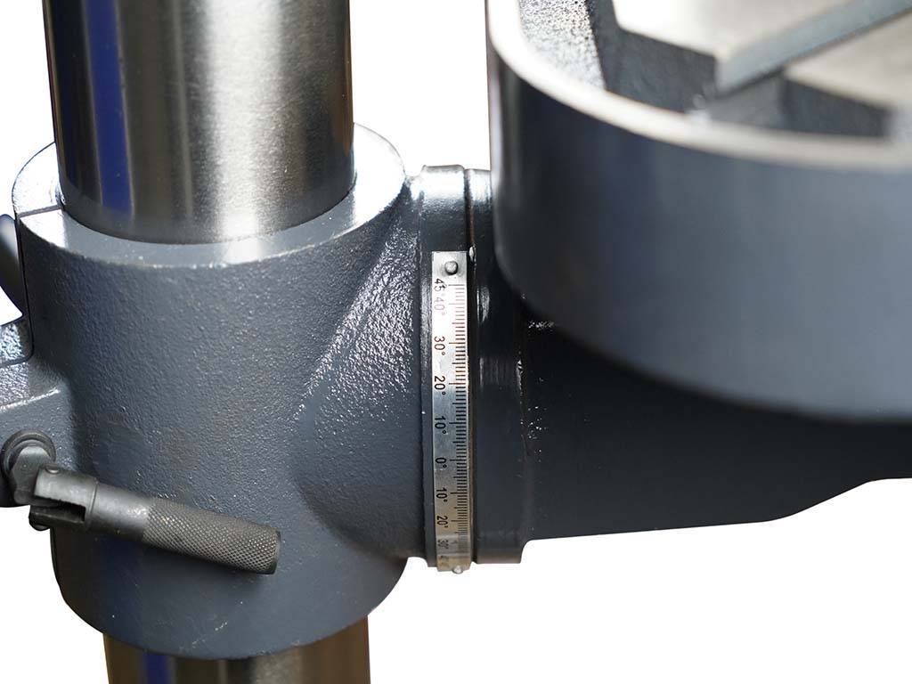 Контроль угла поворота сверлильного стола Metal Master M25D осуществляется по шкале угломера.
